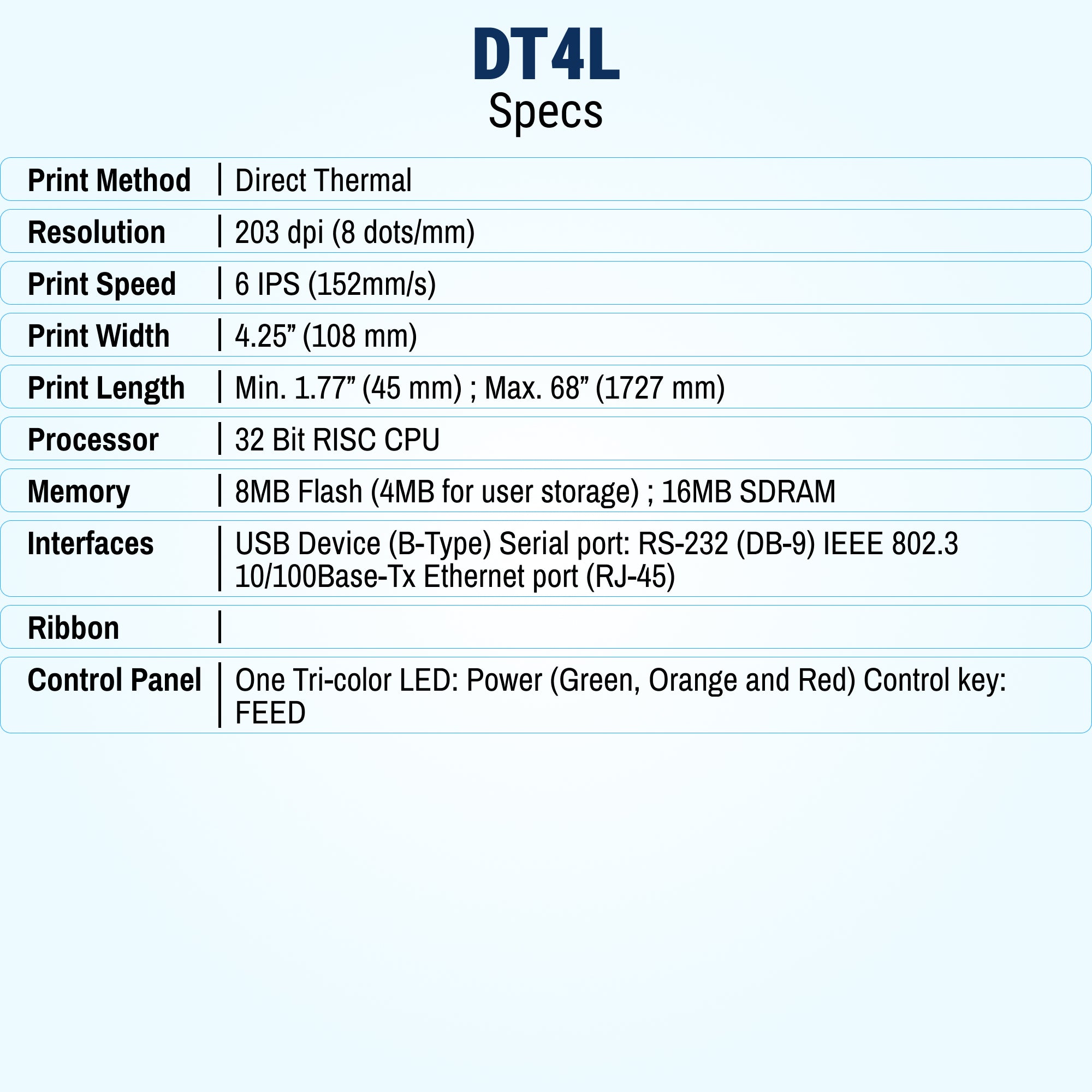 Connectivity options include USB, Serial, and Ethernet, and the adjustable reflective + fixed transmissive sensors ensure accurate tracking of any linerless media. Built tough for busy workstations, the DT4L delivers professional results in a compact footprint.