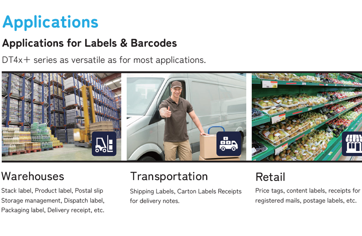 From shipping and dispatch labels to shelf tags and receipts, DT4x+ handles high-volume tasks with clear 203 dpi output and a space-saving design.