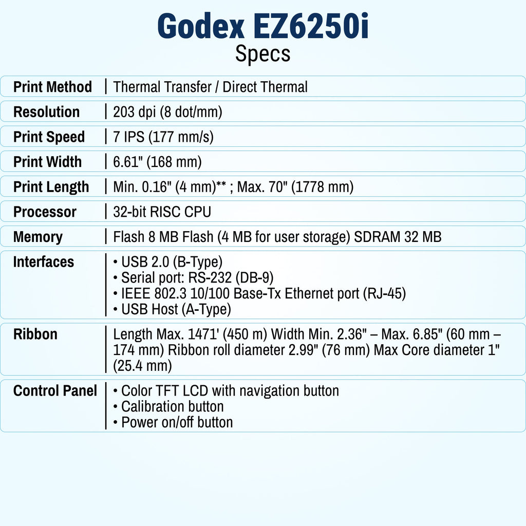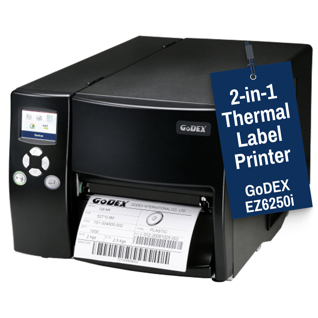 GoDEX EZ6250i Thermal Printer - 6" 203 DPI, 2-in-1 Manufacturing Printer with 3-Year Warranty