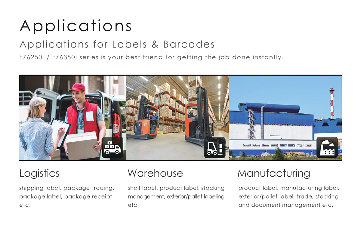 From logistics and warehousing to full-scale manufacturing, the EZ6250i / EZ6350i delivers sharp, durable prints on every label. Perfect for shipping, storage, and production workflows requiring strength and accuracy.
