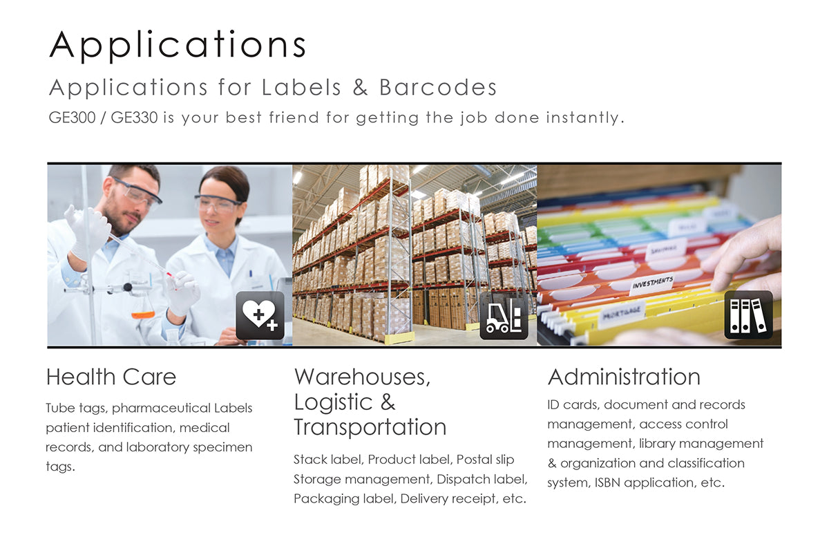From healthcare specimen tags to warehouse logistics and office administration, the GE Series handles labels across industries with speed and precision.