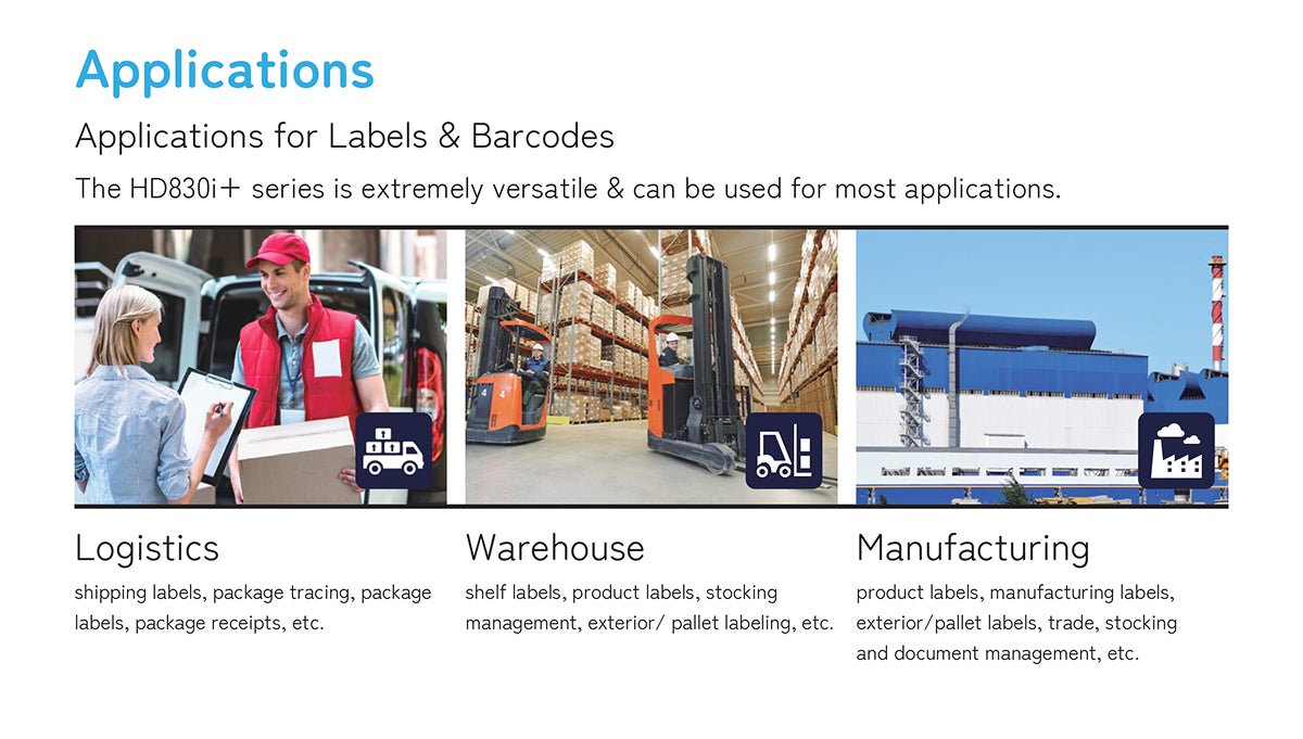 Built for large-volume, high-efficiency tasks, the HD830i+ handles 8-inch wide labels with ease. Ideal for oversized shipping, pallet, and industrial labels.