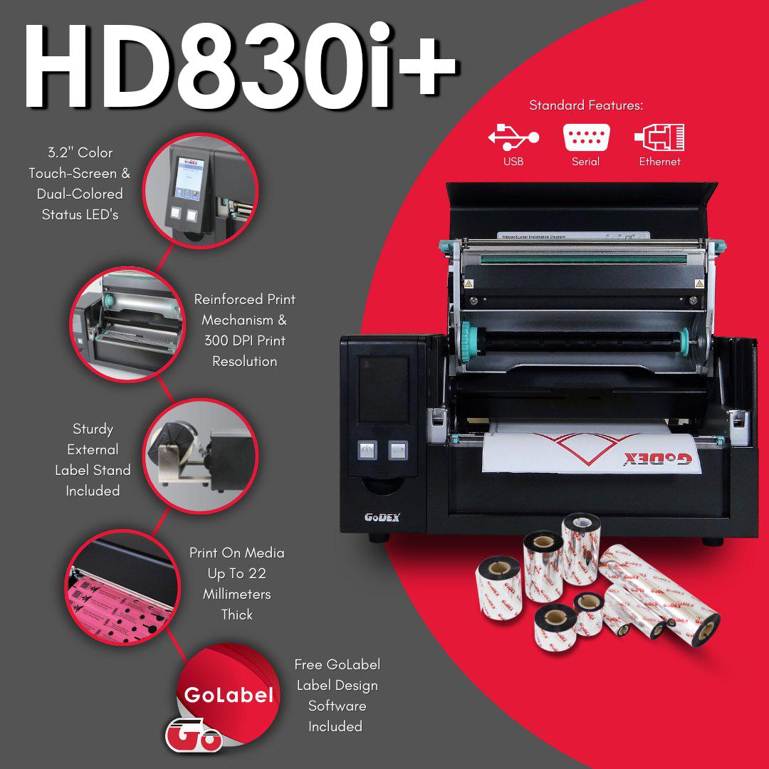 GoDEX HD830i+ Thermal Printer - 8" Wide, 300 DPI Industrial Barcode Label Printer | 3-Year Warranty