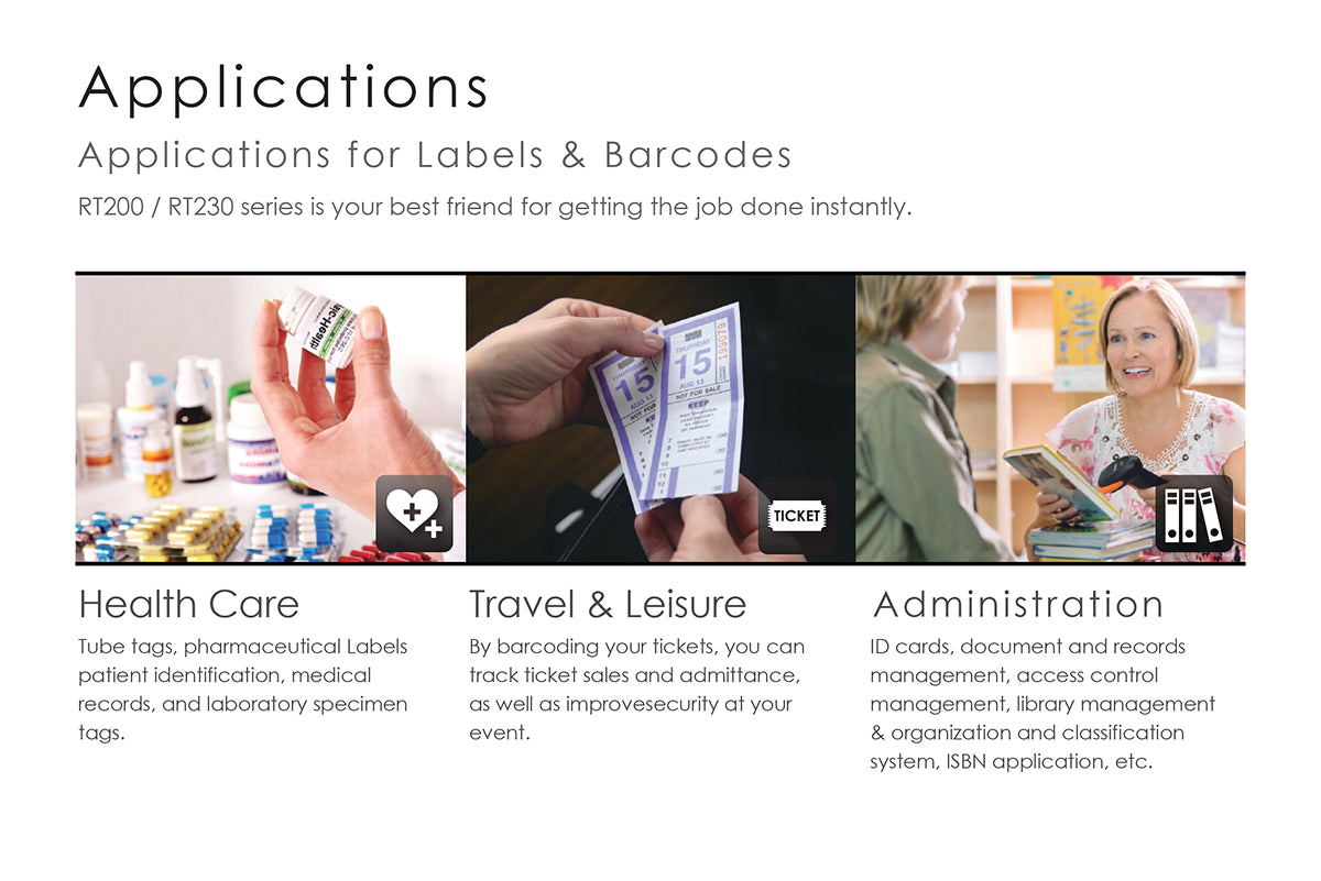 From pharmacy and healthcare to events and administration, the RT200 / RT230 series supports high-quality labeling on demandβideal for tickets, ID cards, and specimen tags.