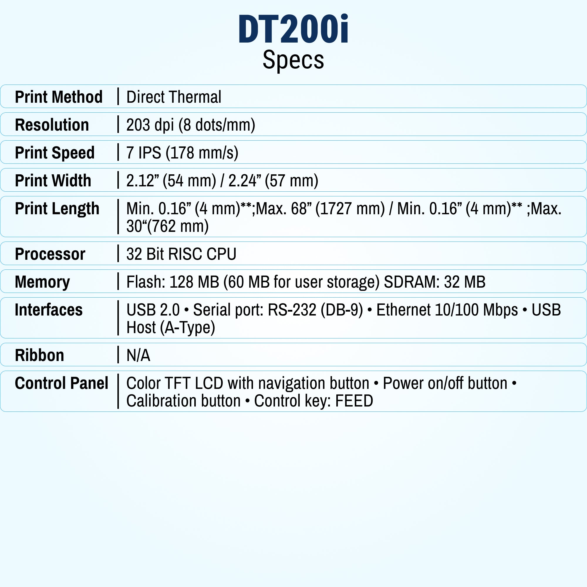 DT200/DT200i direct-thermal printers deliver crisp 203/300 dpi labels up to 7 ips in a space-saving body. Optional 2.4″ color screen and USB/Serial/Ethernet make setup fast for retail, labs, and ticketing.