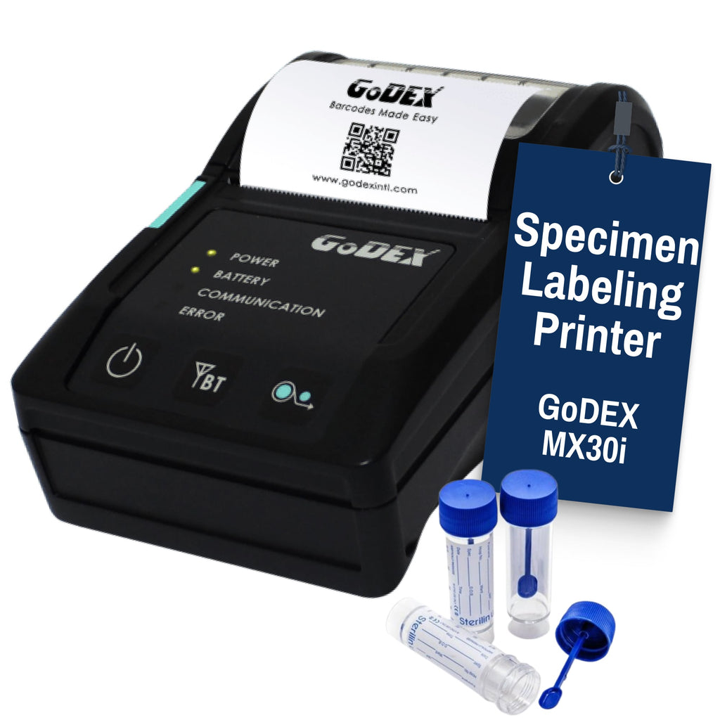 The GoDEX MX30i is a portable specimen labeling printer designed for mobile clinical workflows. It prints clear and reliable labels for specimen transport bags, collection cups, vials, containers and administrative lab forms. Because it uses direct thermal printing, there is no ink or toner to replace, and staff can print labels anywhere they need them. This makes the MX30i ideal for bedside specimen collection, mobile blood draws, outpatient rooms, satellite labs and field clinics.