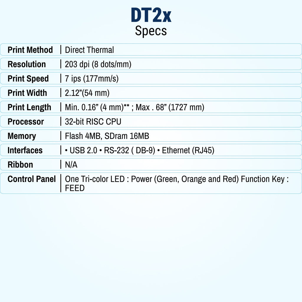 DT200/DT200i direct-thermal printers deliver crisp 203/300 dpi labels up to 7 ips in a space-saving body. Optional 2.4″ color screen and USB/Serial/Ethernet make setup fast for retail, labs, and ticketing.